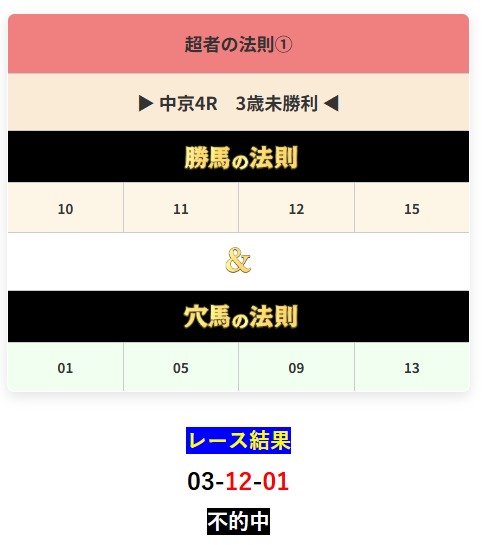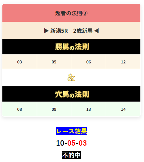 | 新潟10R | 軸馬 | 08.13 | 相手馬 | 01.02.04.12 | 穴馬 | 03.06.07.10.11 | 結果 | 12-10-8 87,390円  |