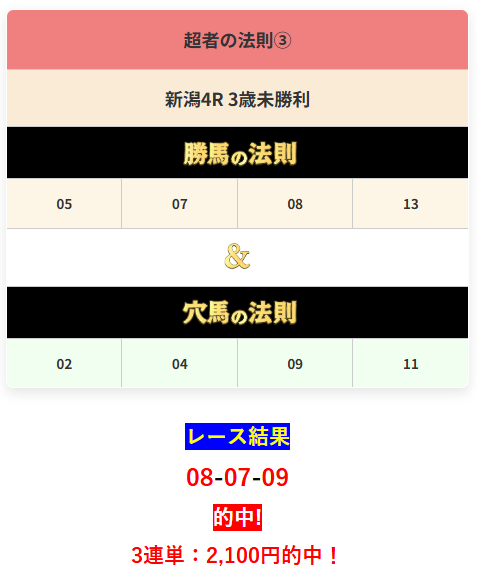 | 新潟8R | 軸馬 | 06.08 | 相手馬 | 01.02.04 | 穴馬 | 05.07.09.10 | 結果 | 6-4-7 17,920円 3連単 的中!  |