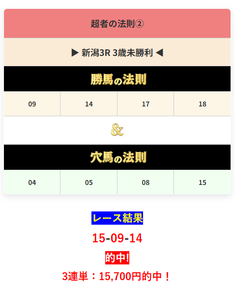 | 新潟9R | 軸馬 | 07.08 | 相手馬 | 06.09.12.13 | 穴馬 | 03.04.05.14.16.18 | 結果 | “18-8-13  18,890円 3連単 的中!”  |