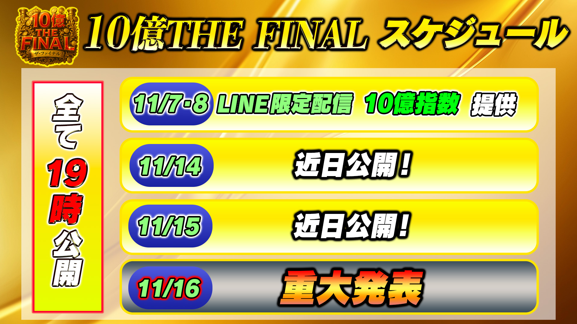 | 小松さん、もう年末に差し掛かりますね。10億指数についての説明を読まさせて頂きました。もう、本当に提供される日が楽しみで仕方ありません。そのまた次の週にも物凄くサービスが待っているんですかね。 これはもう10億円実現クラブさん、よろしくお願いしますね! |
